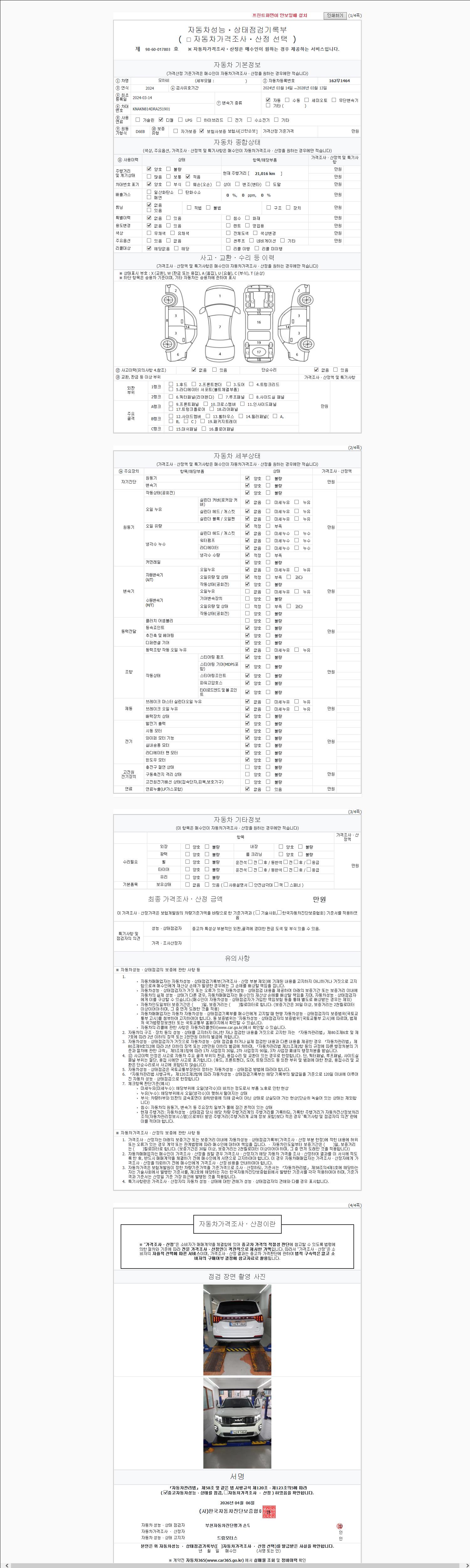 자동차관리법 시행규칙 제120조의 규정에 따라 별지 제 82호서식 《중고자동차 성능, 상태점검 기록부》를 발행한 성능, 상태점검자 및 매매자는 아래의 보증기간 또는 보증거리 이내의 중고자동차, 성능점검 기록부에 기재된 내용과 자동차의 실제 성능, 상태가 다른 경우 계약 또는 관계법령에 따라 매수인에 대하여 책임을 집니다.