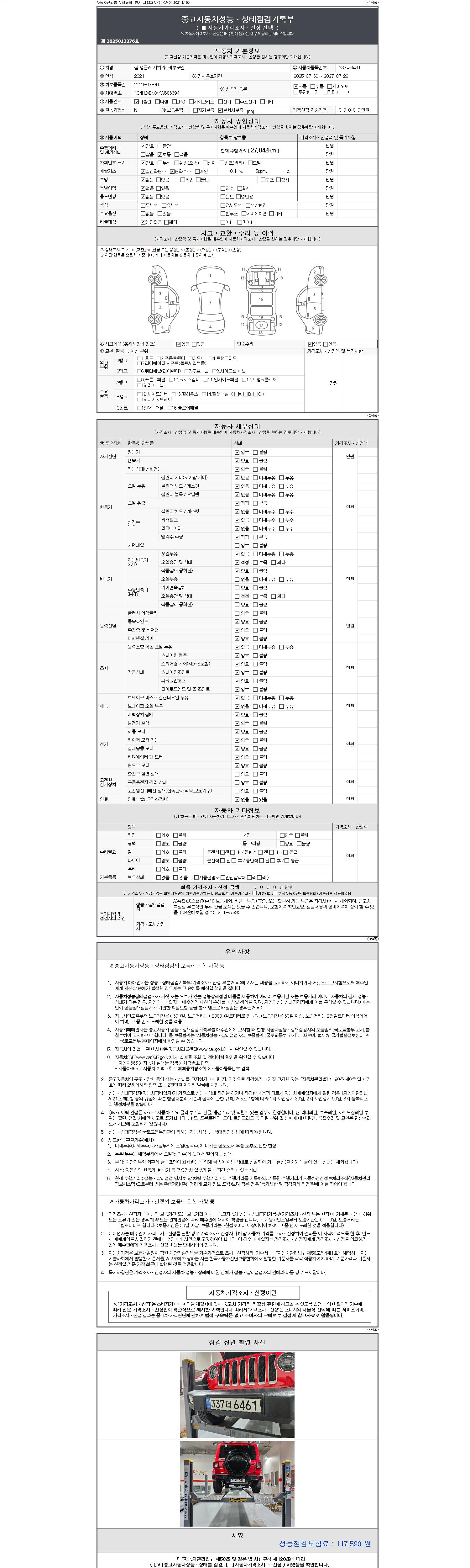 자동차관리법 시행규칙 제120조의 규정에 따라 별지 제 82호서식 《중고자동차 성능, 상태점검 기록부》를 발행한 성능, 상태점검자 및 매매자는 아래의 보증기간 또는 보증거리 이내의 중고자동차, 성능점검 기록부에 기재된 내용과 자동차의 실제 성능, 상태가 다른 경우 계약 또는 관계법령에 따라 매수인에 대하여 책임을 집니다.