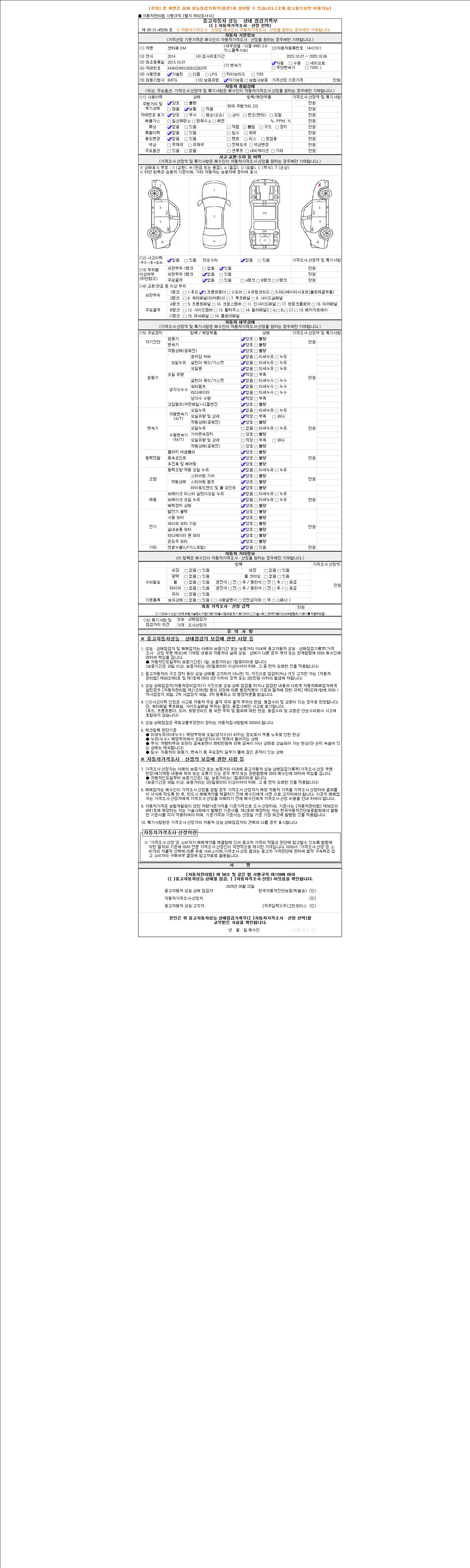 -중고자동차 매매업자를 통해 차량을 구입하실 경우 반드시 "중고자동차 성능, 상태점검 기록부"를 교뷰 받으셔야 하며, 매매업자는 반드시 의무 교부 하여야 압니다.