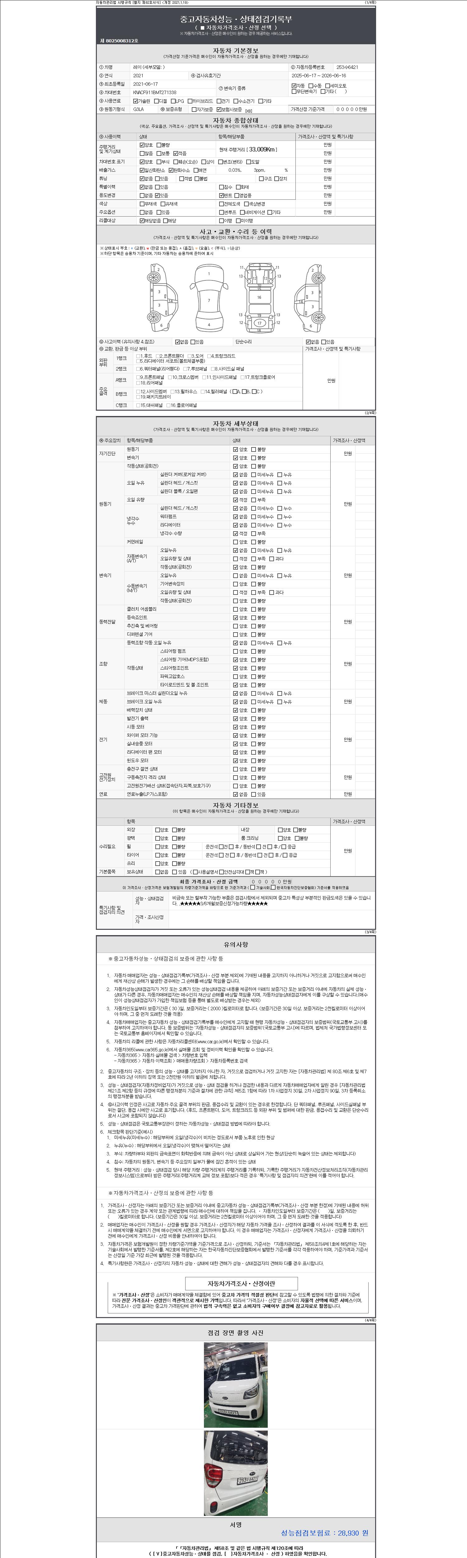자동차관리법 시행규칙 제120조의 규정에 따라 별지 제 82호서식 《중고자동차 성능, 상태점검 기록부》를 발행한 성능, 상태점검자 및 매매자는 아래의 보증기간 또는 보증거리 이내의 중고자동차, 성능점검 기록부에 기재된 내용과 자동차의 실제 성능, 상태가 다른 경우 계약 또는 관계법령에 따라 매수인에 대하여 책임을 집니다.