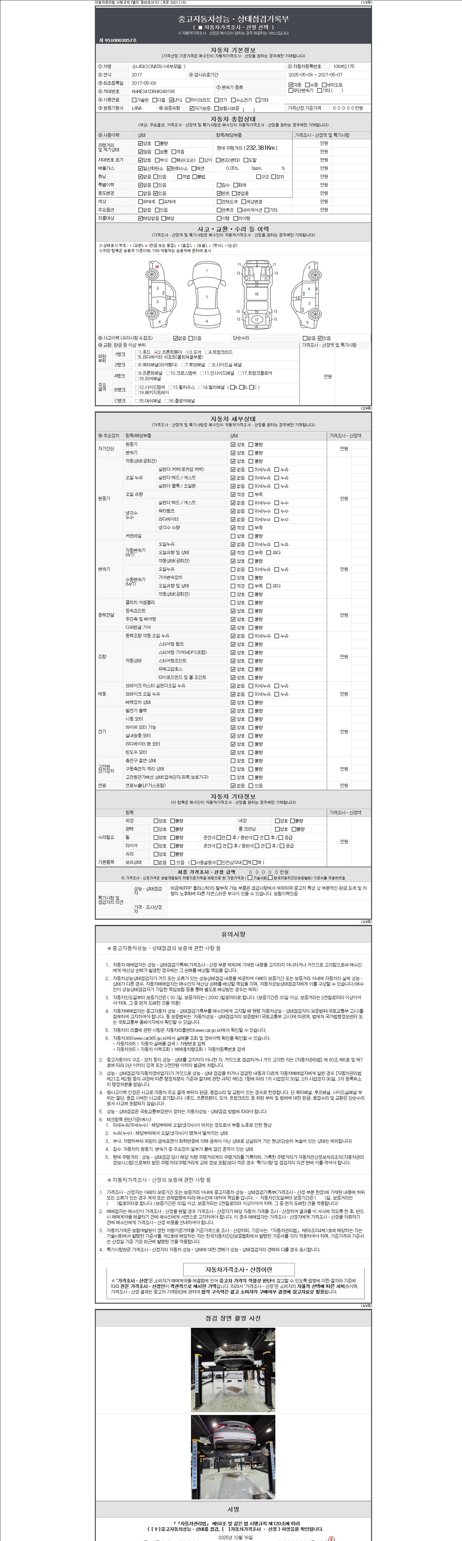 자동차관리법 시행규칙 제120조의 규정에 따라 별지 제 82호서식 《중고자동차 성능, 상태점검 기록부》를 발행한 성능, 상태점검자 및 매매자는 아래의 보증기간 또는 보증거리 이내의 중고자동차, 성능점검 기록부에 기재된 내용과 자동차의 실제 성능, 상태가 다른 경우 계약 또는 관계법령에 따라 매수인에 대하여 책임을 집니다.