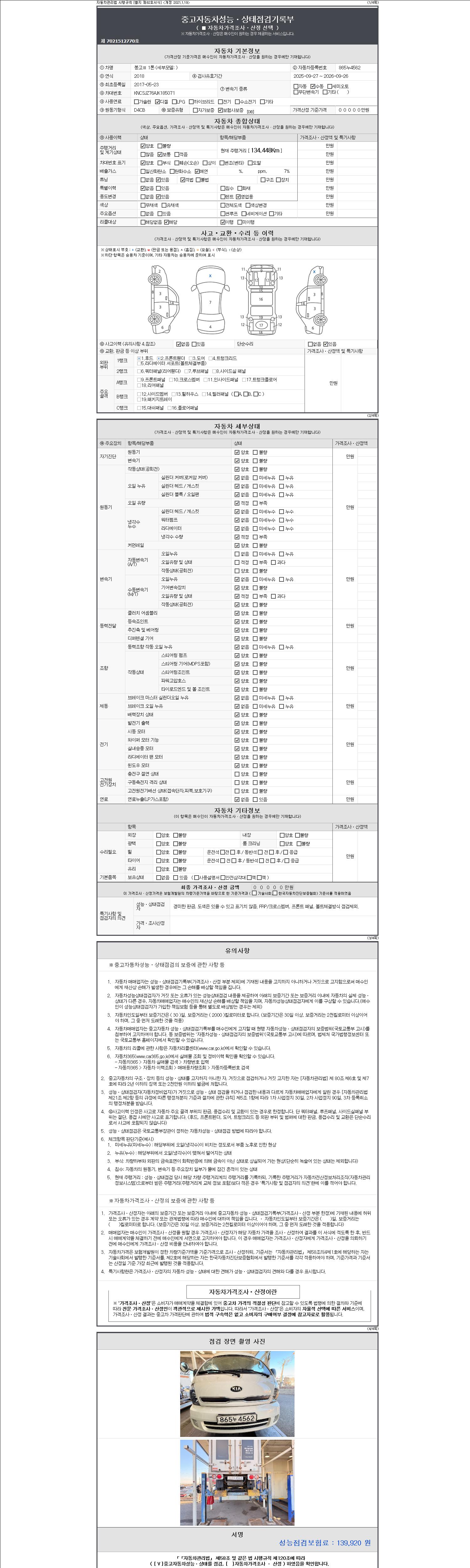 자동차관리법 시행규칙 제120조의 규정에 따라 별지 제 82호서식 《중고자동차 성능, 상태점검 기록부》를 발행한 성능, 상태점검자 및 매매자는 아래의 보증기간 또는 보증거리 이내의 중고자동차, 성능점검 기록부에 기재된 내용과 자동차의 실제 성능, 상태가 다른 경우 계약 또는 관계법령에 따라 매수인에 대하여 책임을 집니다.