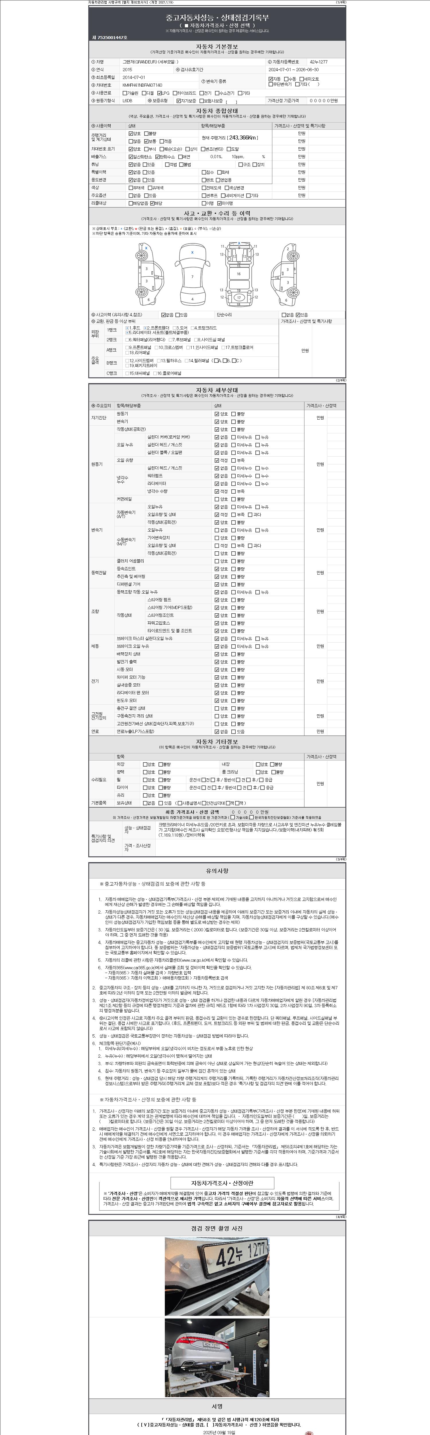 자동차관리법 시행규칙 제120조의 규정에 따라 별지 제 82호서식 《중고자동차 성능, 상태점검 기록부》를 발행한 성능, 상태점검자 및 매매자는 아래의 보증기간 또는 보증거리 이내의 중고자동차, 성능점검 기록부에 기재된 내용과 자동차의 실제 성능, 상태가 다른 경우 계약 또는 관계법령에 따라 매수인에 대하여 책임을 집니다.