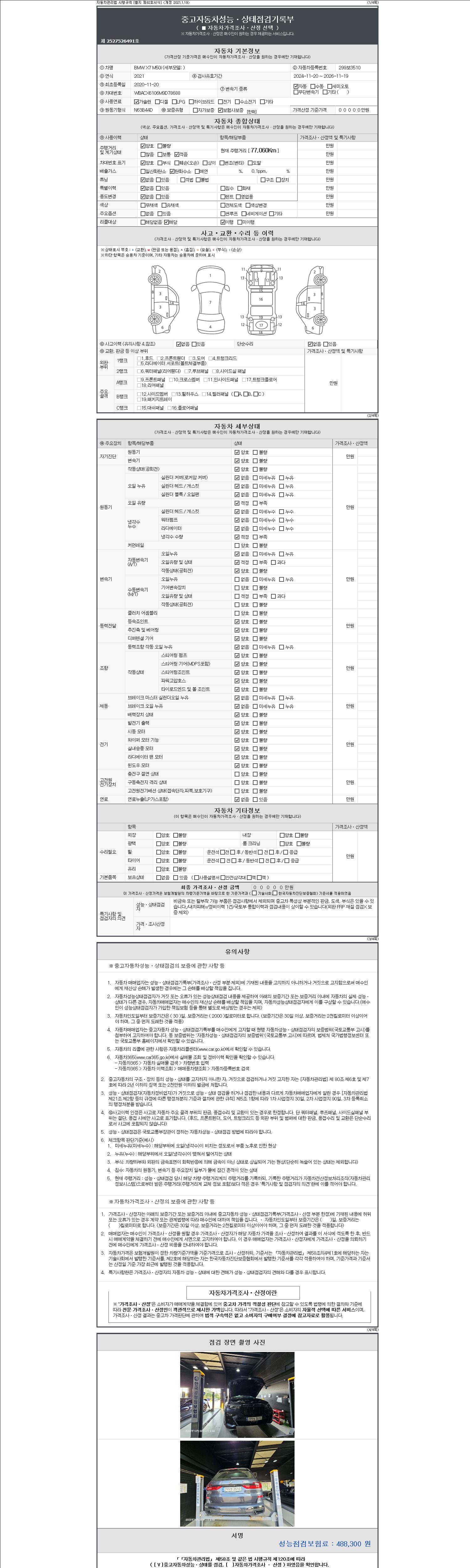 자동차관리법 시행규칙 제120조의 규정에 따라 별지 제 82호서식 《중고자동차 성능, 상태점검 기록부》를 발행한 성능, 상태점검자 및 매매자는 아래의 보증기간 또는 보증거리 이내의 중고자동차, 성능점검 기록부에 기재된 내용과 자동차의 실제 성능, 상태가 다른 경우 계약 또는 관계법령에 따라 매수인에 대하여 책임을 집니다.