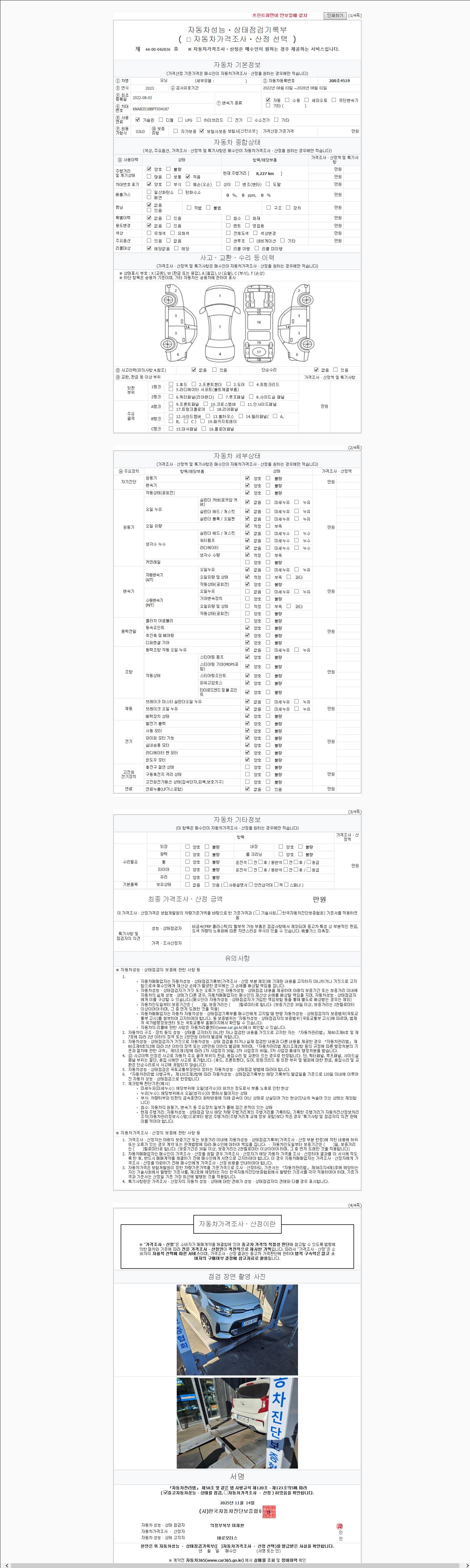 사고유무 성능기록부 참조 제시번호 제 2025210528 호