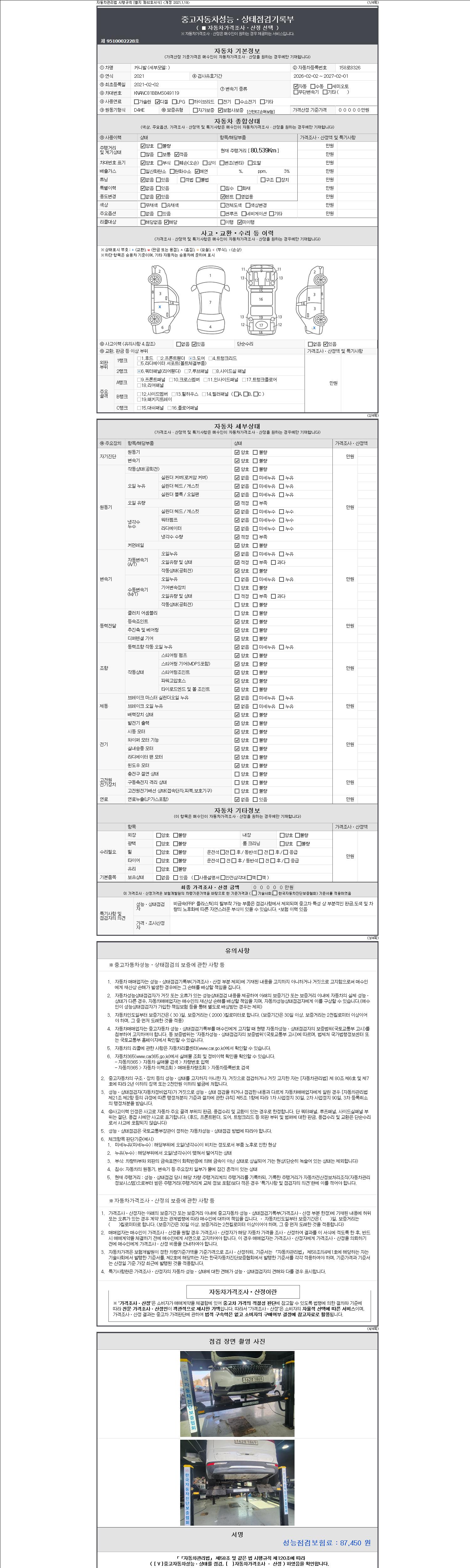자동차관리법 시행규칙 제120조의 규정에 따라 별지 제 82호서식 《중고자동차 성능, 상태점검 기록부》를 발행한 성능, 상태점검자 및 매매자는 아래의 보증기간 또는 보증거리 이내의 중고자동차, 성능점검 기록부에 기재된 내용과 자동차의 실제 성능, 상태가 다른 경우 계약 또는 관계법령에 따라 매수인에 대하여 책임을 집니다.