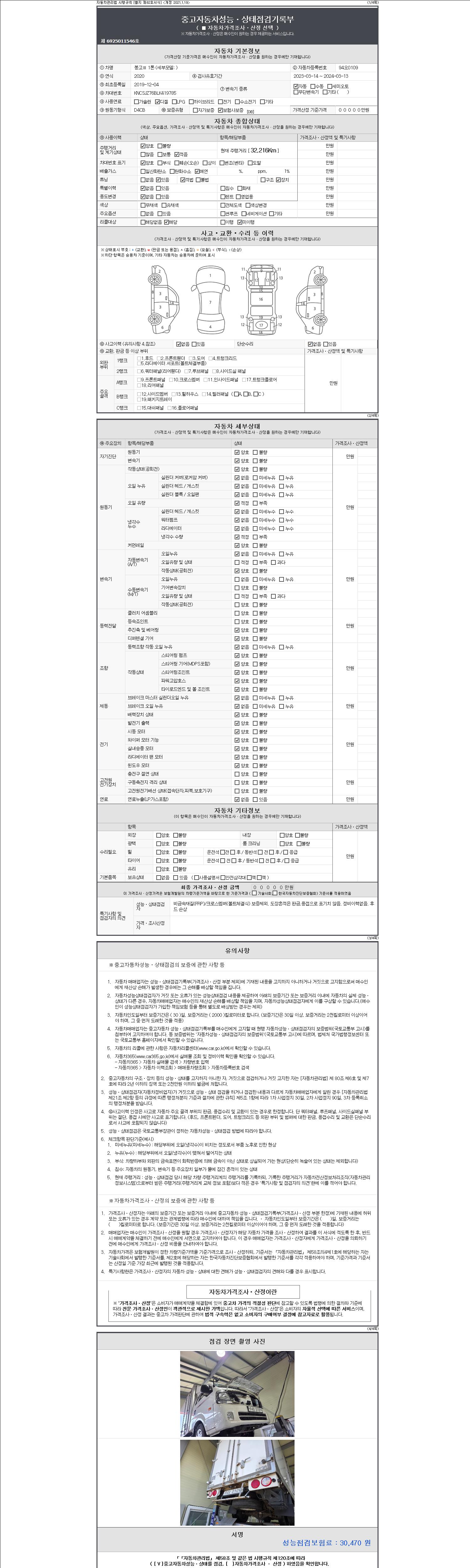 자동차관리법 시행규칙 제120조의 규정에 따라 별지 제 82호서식 《중고자동차 성능, 상태점검 기록부》를 발행한 성능, 상태점검자 및 매매자는 아래의 보증기간 또는 보증거리 이내의 중고자동차, 성능점검 기록부에 기재된 내용과 자동차의 실제 성능, 상태가 다른 경우 계약 또는 관계법령에 따라 매수인에 대하여 책임을 집니다.