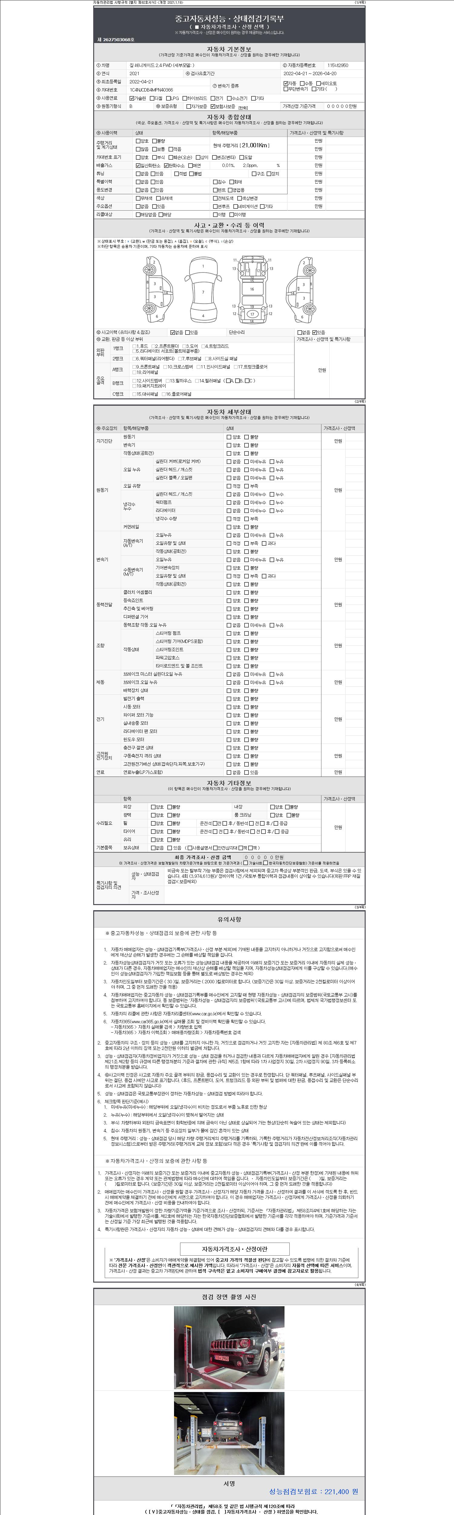 자동차관리법 시행규칙 제120조의 규정에 따라 별지 제 82호서식 《중고자동차 성능, 상태점검 기록부》를 발행한 성능, 상태점검자 및 매매자는 아래의 보증기간 또는 보증거리 이내의 중고자동차, 성능점검 기록부에 기재된 내용과 자동차의 실제 성능, 상태가 다른 경우 계약 또는 관계법령에 따라 매수인에 대하여 책임을 집니다.
