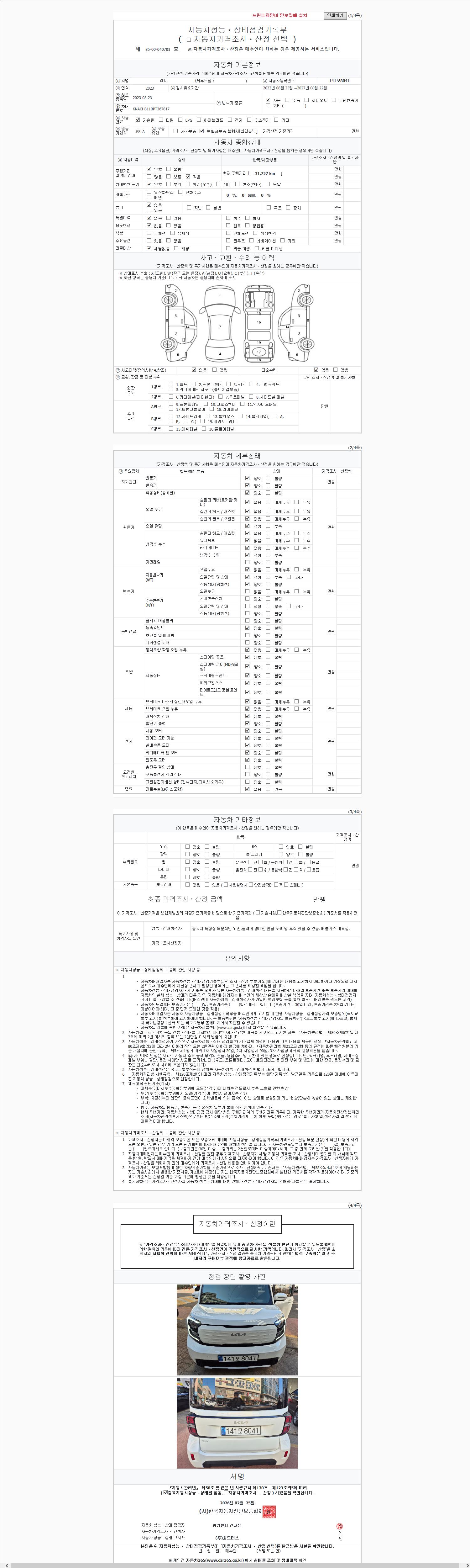 | 주행거리 | 31,562 km | 차량번호 | 141모8041 | 사고유무 | 성능기록부 참조 | 제시번호 | 제 2147483647 호 |