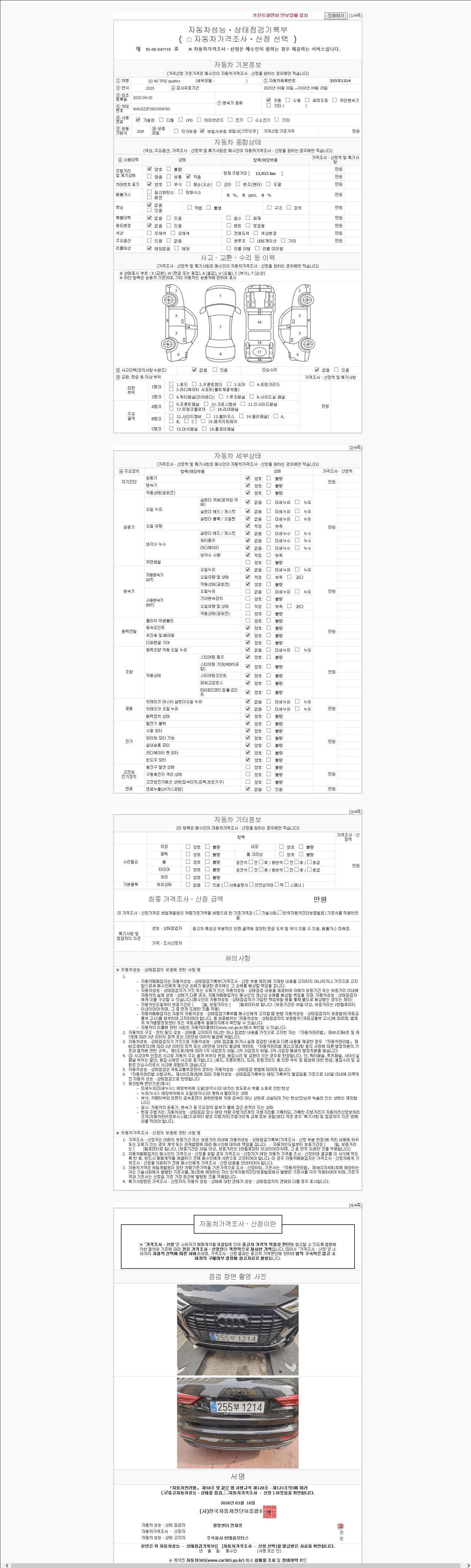 | 주행거리 | 13,915 km | 차량번호 | 255부1214 | 사고유무 | 성능기록부 참조 | 제시번호 | 제 2147483647 호 |